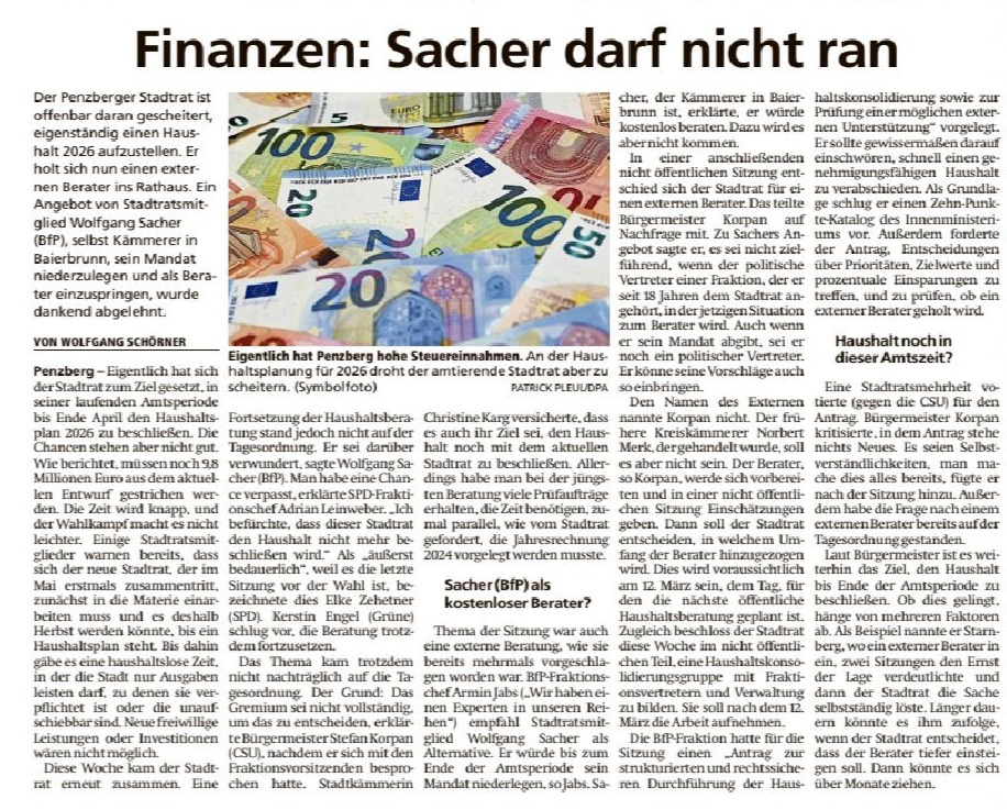 Wir haben bereits im Mai 2024 sowie im März 2025 dem Ersten Bürgermeister eine strukturierte Vorgehensweise zur Haushaltskonsolidierung übermittelt. Unser Ziel war und ist es, die berufliche Erfahrung von Wolfgang Sacher als Kämmerer und über 10 Jahre als Vorsitzender des Rechnungsprüfungsausschusses einzubringen – ausschließlich im Interesse einer tragfähigen und nachhaltigen Lösung für Penzberg.